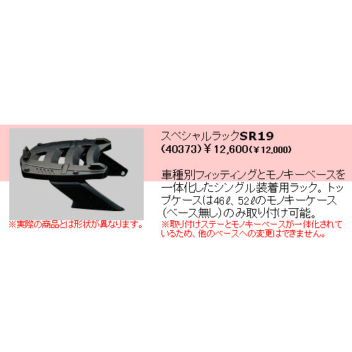 GIVIトップケースをがっちり固定できる専用の車種専用取り付けフィッティングです。 商品概要 メーカー GIVI(ジビ) モデル名 トップケース装着用フィッティング ホンダ シルバーウイング400('01〜'07)用 タイプ モノキーケース用 内容 スペシャルラックSR19 メーカー希望小売価格 ¥12600(税込) 返品・交換 不可 ■商品説明 ●GIVIのトップケースをがっちり固定するための、取り付けカンタン、車種専用フィッティングです。 ●車種別フィッティングとモノキーベースを一体化したシングル装着用ラック。 トップケースは46リッター、52リッターの、モノキーケースのみ取り付け可能。 ■適合車種:ホンダ シルバーウイング400('01〜'07)用 装着時のご注意:ウイングに穴あけ加工が必要。装着例の画像は600の画像です。 ■備考 ●返品・交換:不可 ●注意:この商品には、トップケースはついていません。別売のトップケースが必要です。フィッティングのタイプに応じたトップケースを選択ください。 ■補足