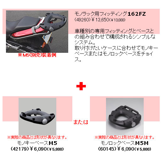 GIVIトップケースをがっちり固定できる専用の車種専用取り付けフィッティングです。 商品概要 メーカー GIVI(ジビ) モデル名 トップケース装着用フィッティング ホンダ ホーネット250('97〜'07)用 タイプ モノキーケース用とモノロックケース用が選択できます。 内容 モノラック用フィッティング+モノキーベースM5またはモノロックベースM5Mのセット メーカー希望小売価格 部品合計¥19740(税込) 返品・交換 不可 ■商品説明 ●GIVIのトップケースをがっちり固定するための、取り付けカンタン、車種専用フィッティングです。 ●フィッティングには2種類あります。モノキーケース用を選択の場合、モノキーケースを、モノロックケース用を選択の場合、モノロックケースを選択ください。いずれのケースもどの容量でも装着できます。またストップランプ付きを選択の場合、配線加工が必要です。 ■適合車種:ホンダ ホーネット250('97〜'07)用 装着時のご注意:特になし ■備考 ●返品・交換:不可 ●注意:この商品には、トップケースはついていません。別売のトップケースが必要です。フィッティングのタイプに応じたトップケースを選択ください。 ■補足