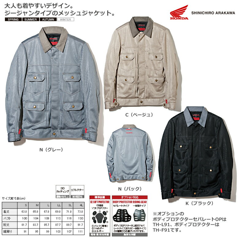 【サイズ】4Lサイズkey:ブルゾン●シンプルで日常生活でも使用出来るデザイン。●表地、裏地、全てがメッシュで出来ているブルゾン。着用して走り出すと快適さが伝わって参ります。●肩、肘、背中にプロテクターを標準装備。●洗濯用ネットを使用して洗濯機で洗う事が出来るので、汗をかいてもお手入れが簡単です。●一体型タイプのボディプロテクター、もしくは中央分割式セパレートタイプのボディプロテクターがオプションで装着可能。【素材】●表地:ポリエステル100%●裏地:ポリエステル100%※オプションのボディプロテクターセパレートOPはTH-L91、ボディプロテクターはTH-F91です。【商品名】Honda×SHINICHIRO ARAKAWA メッシュブルゾン H36 ベージュ 4Lサイズ【商品番号】H7-0SYEL-T3G-C4L【メーカー】HONDA(ホンダ)【サイズ】4Lサイズ