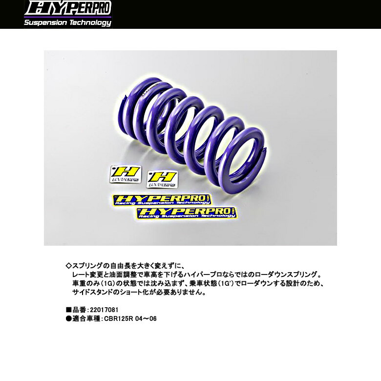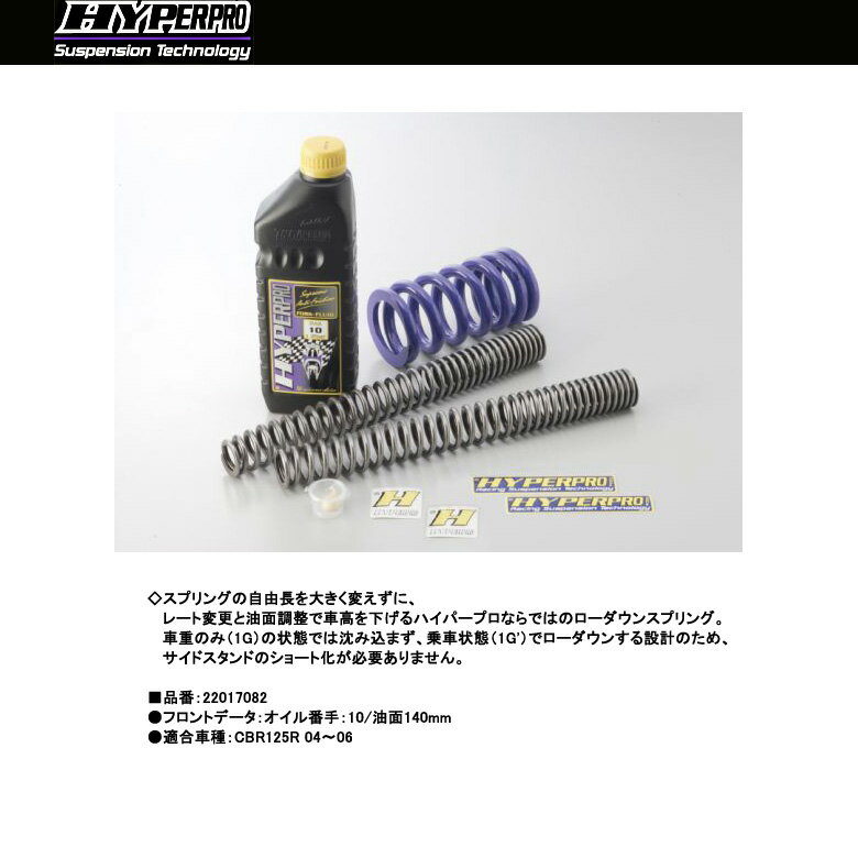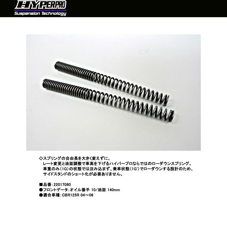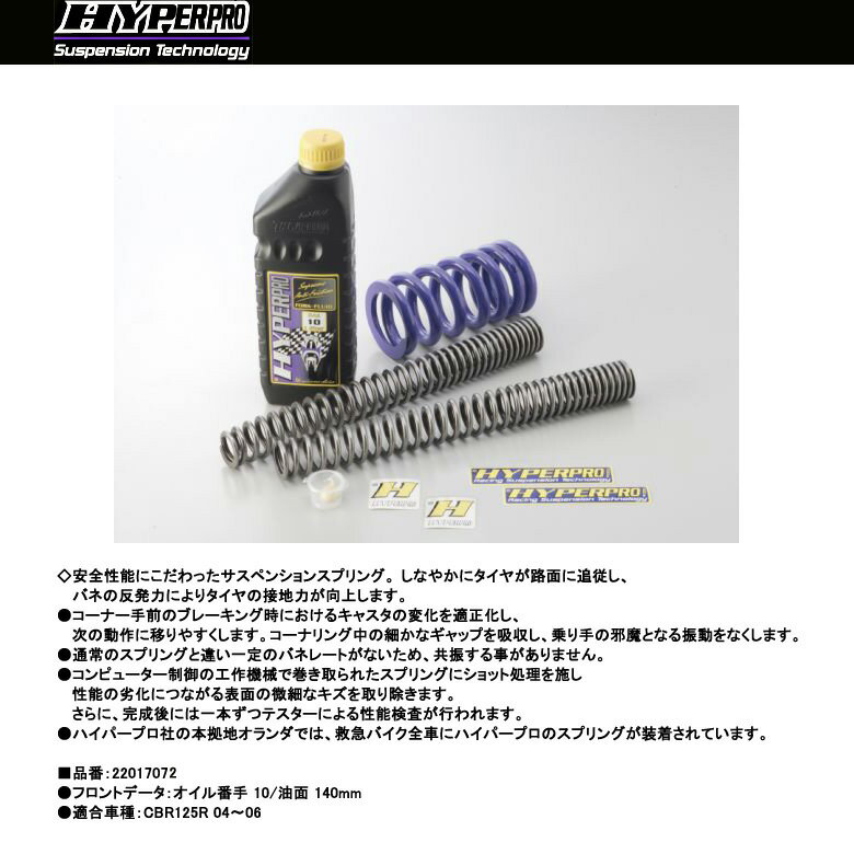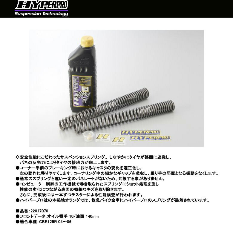 【HYPERPRO】【ハイパープロ】【Honda】【CBR125R 04〜06】サスペンションスプリング フロント【22017070】◇安全性能にこだわったサスペンションスプリング。 しなやかにタイヤが路面に追従し、バネの反発力によりタイヤの接地力が向上します。●コーナー手前のブレーキング時におけるキャスタの変化を適正化し、次の動作に移りやすくします。コーナリング中の細かなギャップを吸収し、乗り手の邪魔となる振動をなくします。●通常のスプリングと違い一定のバネレートがないため、共振する事がありません。●コンピューター制御の工作機械で巻き取られたスプリングにショット処理を施し、性能の劣化につながる表面の微細なキズを取り除きます。さらに、完成後には一本ずつテスターによる性能検査が行われます。●ハイパープロ社の本拠地オランダでは、救急バイク全車にハイパープロのスプリングが装着されています。■品番:22017070●フロントデータ:オイル番手 10/油面 140mm●適合車種:CBR125R 04〜06※掲載商品と実際の商品との色合いが異なる場合がございます。ご了承の程、宜しくお願いします。※商品は予告なく仕様の変更や販売を終了している場合がございますので予めご了承下さい。【HYPERPRO】【ハイパープロ】【Honda】【CBR125R 04〜06】サスペンションスプリング フロント【22017070】■ 商品情報◇安全性能にこだわったサスペンションスプリング。 しなやかにタイヤが路面に追従し、バネの反発力によりタイヤの接地力が向上します。●コーナー手前のブレーキング時におけるキャスタの変化を適正化し、次の動作に移りやすくします。コーナリング中の細かなギャップを吸収し、乗り手の邪魔となる振動をなくします。●通常のスプリングと違い一定のバネレートがないため、共振する事がありません。●コンピューター制御の工作機械で巻き取られたスプリングにショット処理を施し、性能の劣化につながる表面の微細なキズを取り除きます。さらに、完成後には一本ずつテスターによる性能検査が行われます。●ハイパープロ社の本拠地オランダでは、救急バイク全車にハイパープロのスプリングが装着されています。■品番:22017070●フロントデータ:オイル番手 10/油面 140mm●適合車種:CBR125R 04〜06