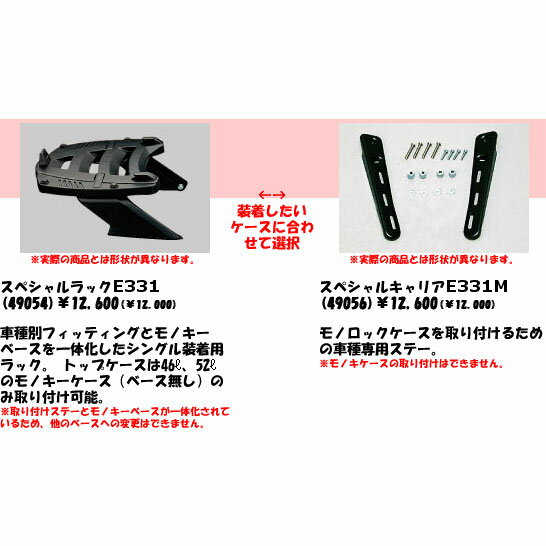 GIVIトップケースをがっちり固定できる専用の車種専用取り付けフィッティングです。 商品概要 メーカー GIVI(ジビ) モデル名 トップケース装着用フィッティング グランドマジェスティ【5VG】('04〜'07) タイプ モノキーケース用またはモノロックケース用 内容 スペシャルラックE331またはスペシャルキャリーE331M メーカー希望小売価格 ¥12600(税込) 返品・交換 不可 ■商品説明 ●GIVIのトップケースをがっちり固定するための、取り付けカンタン、車種専用フィッティングです。 ●車種別の専用フィッティングとベースとの組み合わせで構成されるシンプルなシステム。フィッティングには2種類あります。モノキーケース用を選択の場合、モノキーケースを、モノロックケース用を選択の場合、モノロックケースを選択ください。モノキーケースは46L、52Lのみ装着可能。またストップランプ付きを選択の場合、配線加工が必要です。 ■適合車種:ヤマハ グランドマジェスティ【5VG】('04〜'07) 装着時のご注意:特になし ■備考 ●返品・交換:不可 ●注意:この商品には、トップケースはついていません。別売のトップケースが必要です。フィッティングのタイプに応じたトップケースを選択ください。 ■補足