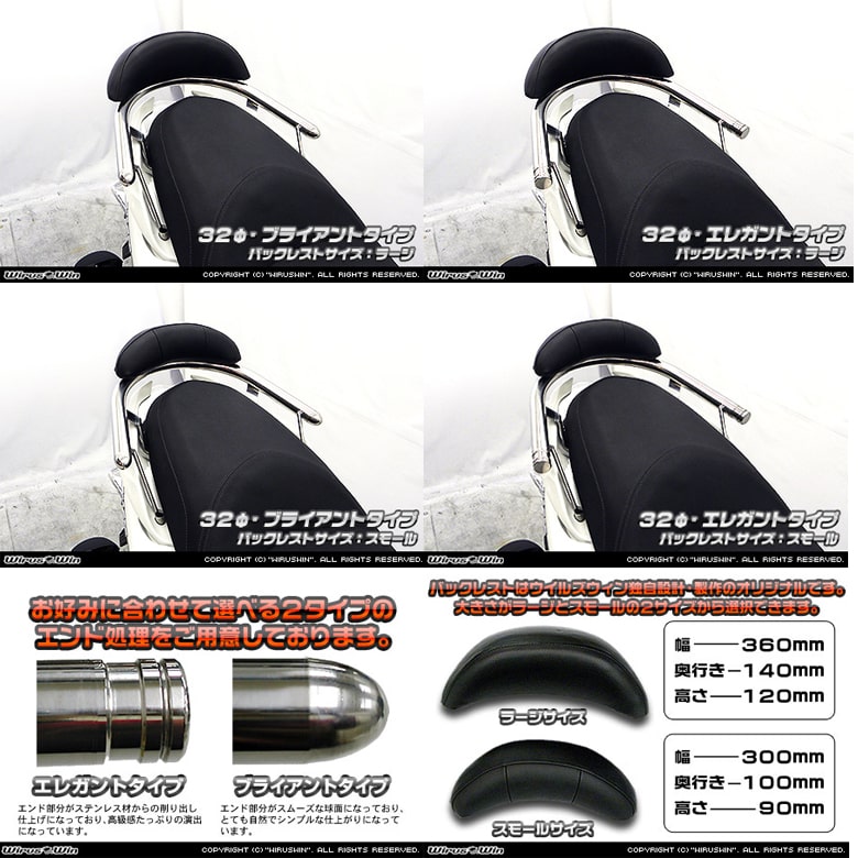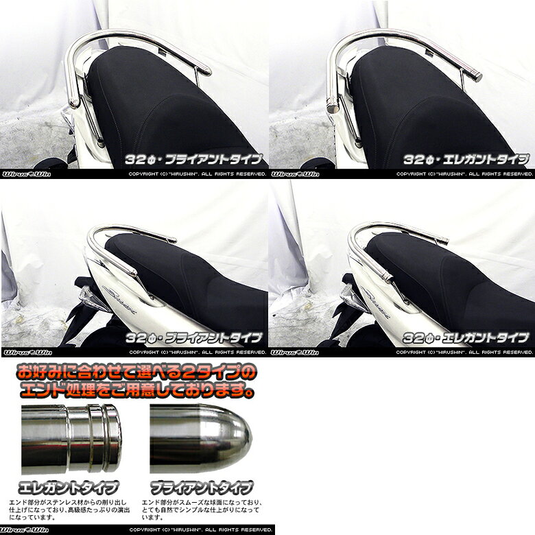 【Yamaha】【ヤマハ】【WirusWin】【ウイルズウィン】【Majesty S】【マジェスティ S】【マジェスティS(SMAX)用 ソリッドリアボックス付きタンデムバー ブライアントタイプ/エレガントタイプ】マジェスティS(SMAX)用 ソリッドリアボックス付きタンデムバー ブライアントタイプ/エレガントタイプです。※ マジェスティS【 型式:JBK-SG28J 】SMAX【 型式:SG271 】に適合します。● ウイルズウィン製オリジナルリアボックス(サイズ:390mm (L) x 395mm (W) x 300mm (H) 容量:28L・定価:¥4,200)を装備したタンデムバーです。 ウイルズウィン独自のリアボックスを装備する事により、価格を大幅に抑えることができました。 ケースの材質はCOOCASE、GIVIで使用されている無塗装ブラックのABS製で、丈夫な作りになっています。 リアボックスの取り外しは手締めボルト1本で簡単に脱着でき、 持ち運びが簡単にできるのでいたずらや盗難から大切な荷物を守る事ができます。 装備されているリアボックスはディフューザーダクトなどの 付加物のある大きめのフルフェイスでも収納できるサイズです。● フルフェイスのヘルメットが1個収納できるサイズで最大積載量は3kgのリアボックスと、 タンデムバーの同時装着を可能にしたニューアイテムです。 リアボックスは車種よっては加工や専用ステーを別途購入しないと取り付けできませんが、 タンデムバーにリアボックス用ベースブラケットを融合する事によって無加工で装着できるようにしました。● リアボックス用ベースブラケットには、COOCASE(クーケース)社 製リアボックス、GIVI(ジビ)社 製リアボックスの ベースを取り付ける専用穴も開いており、ボルトオンで取り付け可能です。 その他汎用リアボックスも取り付け穴を利用して取り付けできます。 取り付けするリアボックスの容量はおよそ28Lまでのボックスをお取り付けください。● 材質は、耐久性、耐腐食性の高いオールステンレス製です。 仕上げはバフ掛けを施していますので、高級感タップリでドレスアップにも最適の逸品です!● バーの太さは32mm径と太めのパイプを使用しています。 パッセンジャーが握りやすく力を入れやすいので、安全性も高くなっております。 バーエンドの形状をお好みに応じて エレガントタイプ と ブライアントタイプ の 2タイプ から選択して頂けます。● WirusWinステッカー、WirusWInプレート付属。※掲載商品と実際の商品との色合いが異なる場合がございます。ご了承の程、宜しくお願いします。※商品は予告なく仕様の変更や販売を終了している場合がございますので予めご了承下さい。【Yamaha】【ヤマハ】【WirusWin】【ウイルズウィン】【Majesty S】【マジェスティ S】【マジェスティS(SMAX)用 ソリッドリアボックス付きタンデムバー ブライアントタイプ/エレガントタイプ】■機能・特徴マジェスティS(SMAX)用 ソリッドリアボックス付きタンデムバー ブライアントタイプ/エレガントタイプです。※ マジェスティS【 型式:JBK-SG28J 】SMAX【 型式:SG271 】に適合します。● ウイルズウィン製オリジナルリアボックス(サイズ:390mm (L) x 395mm (W) x 300mm (H) 容量:28L・定価:¥4,200)を装備したタンデムバーです。 ウイルズウィン独自のリアボックスを装備する事により、価格を大幅に抑えることができました。 ケースの材質はCOOCASE、GIVIで使用されている無塗装ブラックのABS製で、丈夫な作りになっています。 リアボックスの取り外しは手締めボルト1本で簡単に脱着でき、 持ち運びが簡単にできるのでいたずらや盗難から大切な荷物を守る事ができます。 装備されているリアボックスはディフューザーダクトなどの 付加物のある大きめのフルフェイスでも収納できるサイズです。● フルフェイスのヘルメットが1個収納できるサイズで最大積載量は3kgのリアボックスと、 タンデムバーの同時装着を可能にしたニューアイテムです。 リアボックスは車種よっては加工や専用ステーを別途購入しないと取り付けできませんが、 タンデムバーにリアボックス用ベースブラケットを融合する事によって無加工で装着できるようにしました。● リアボックス用ベースブラケットには、COOCASE(クーケース)社 製リアボックス、GIVI(ジビ)社 製リアボックスの ベースを取り付ける専用穴も開いており、ボルトオンで取り付け可能です。 その他汎用リアボックスも取り付け穴を利用して取り付けできます。 取り付けするリアボックスの容量はおよそ28Lまでのボックスをお取り付けください。● 材質は、耐久性、耐腐食性の高いオールステンレス製です。 仕上げはバフ掛けを施していますので、高級感タップリでドレスアップにも最適の逸品です!● バーの太さは32mm径と太めのパイプを使用しています。 パッセンジャーが握りやすく力を入れやすいので、安全性も高くなっております。 バーエンドの形状をお好みに応じて エレガントタイプ と ブライアントタイプ の 2タイプ から選択して頂けます。● WirusWinステッカー、WirusWInプレート付属。