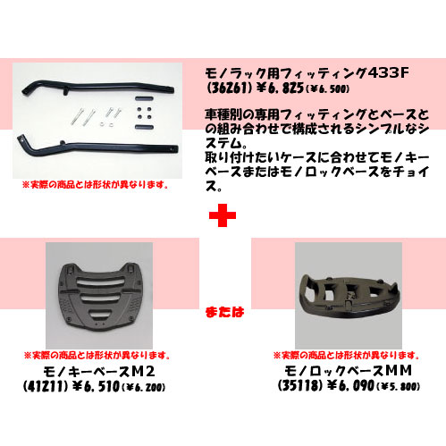 GIVIトップケースをがっちり固定できる専用の車種専用取り付けフィッティングです。 商品概要 メーカー GIVI(ジビ) モデル名 トップケース装着用フィッティング カワサキ ZRX1100/2(’97-’99) タイプ モノキーケース用とモノロックケース用が選択できます。 内容 モノラック用フィッティング433F+モノキーベースM2またはモノロックベースMM メーカー希望小売価格 部品合計¥12915(税込)/¥13335(税込) 返品・交換 不可 ■商品説明 ●GIVIのトップケースをがっちり固定するための、取り付けカンタン、車種専用フィッティングです。 ●フィッティングには2種類あります。モノキーケース用を選択の場合、モノキーケースを、モノロックケース用を選択の場合、モノロックケースを選択ください。いずれのケースもどの容量でも装着できます。またストップランプ付きを選択の場合、配線加工が必要です。 ■適合車種: カワサキ ZRX1100/2(’97-’99) 装着時のご注意:グラブバーは取り外し要。ふちゴム外す。 ■備考 ●返品・交換:不可 ●注意:この商品には、トップケースはついていません。別売のトップケースが必要です。フィッティングのタイプに応じたトップケースを選択ください。 ■補足